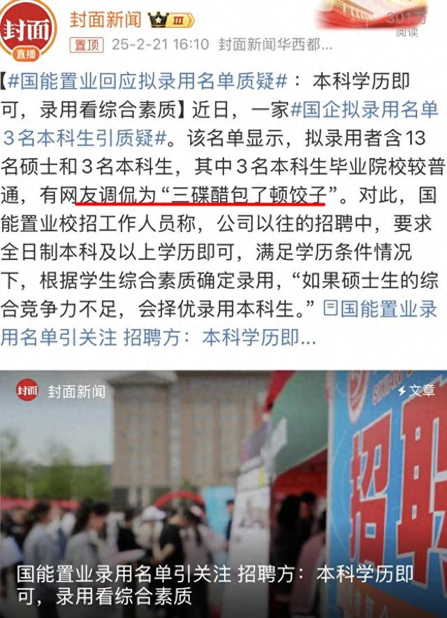 一家国企的拟录用名单突然被挂在热搜,受到诟病。其实新闻标题还不够形象——3名本科生被录用,乍一看是看不出差距的。毕竟,本科生也相当不错啦。